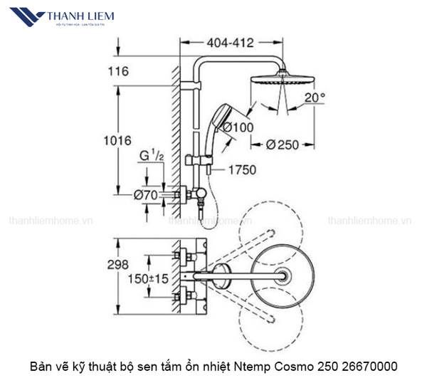 Bát Sen Trần Lớn (Ø 250 mm): Đầu vòi sen cây lớn mang lại trải nghiệm tắm sang trọng, dòng nước êm dịu và sảng khoái, bao phủ toàn thân, tạo cảm giác hòa mình trong mưa tự nhiên.