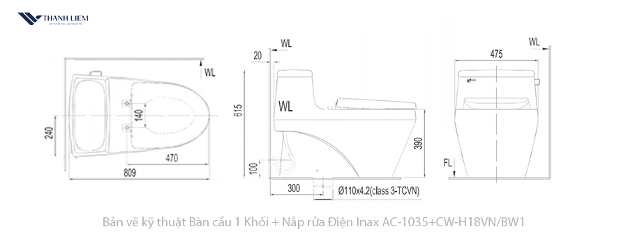 Mô tả Bồn cầu 1 Khối Inax AC-1035 + Nắp rửa Điện CW-H18VN