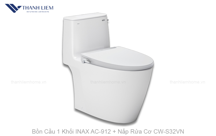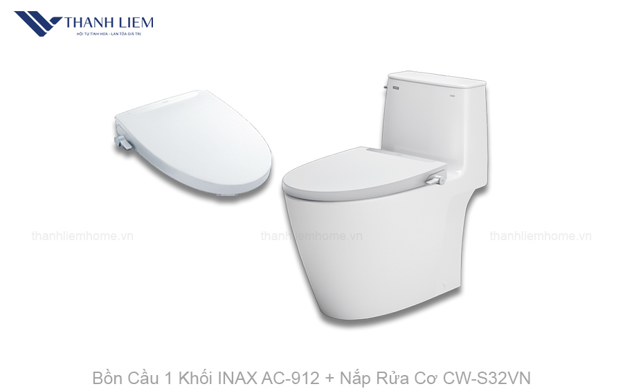 Bộ bồn cầu 1 Khối INAX AC-912 + Nắp Rửa Cơ CW-S32VN là giải pháp vệ sinh hiện đại, kết hợp bồn cầu một khối liền mạch, thiết kế sang trọng và nắp rửa cơ CW-S32VN. Sản phẩm nổi bật với vành trơn láng dễ vệ sinh, công nghệ xả vành Rim mạnh mẽ (4.5 lít), cùng nắp rửa cơ không dùng điện với thiết kế mỏng gọn và hai vòi phun rửa chuyên biệt, mang lại sự sạch sẽ, tiện nghi và thẩm mỹ cao cho không gian phòng tắm.