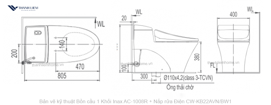 | Đặc điểm | Bồn Cầu AC-1008R | Nắp Rửa CW-KB22AVN |