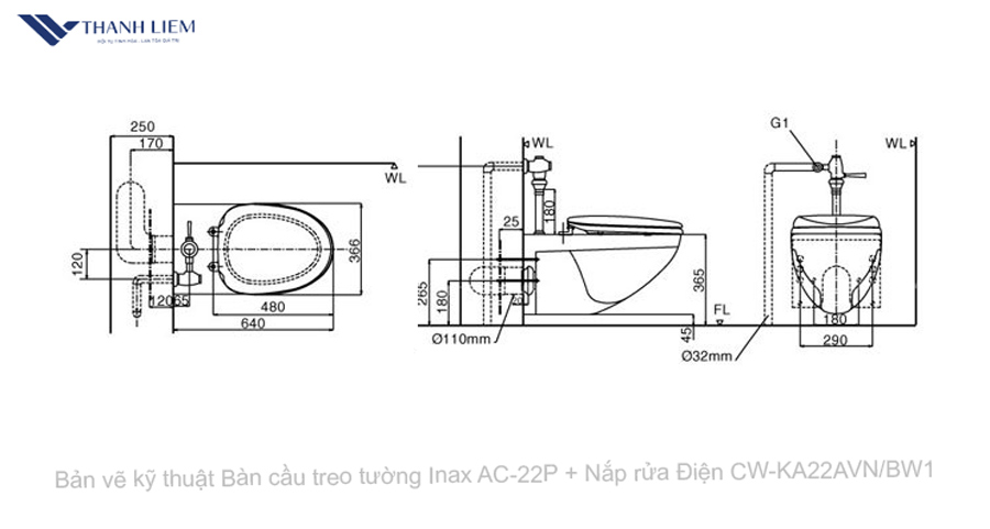 Mô tả Bàn cầu treo tường Inax AC-22P + Nắp rửa CW-KA22AVN/BW1