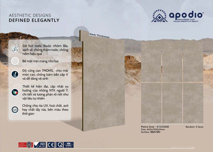 Bề mặt chống trơn vượt trội: Với chỉ số chống trơn trượt đạt từ R10 trở lên, gạch đảm bảo an toàn tuyệt đối cho người sử dụng, đặc biệt là trong các khu vực có mật độ đi lại cao hoặc dễ tiếp xúc với độ ẩm.