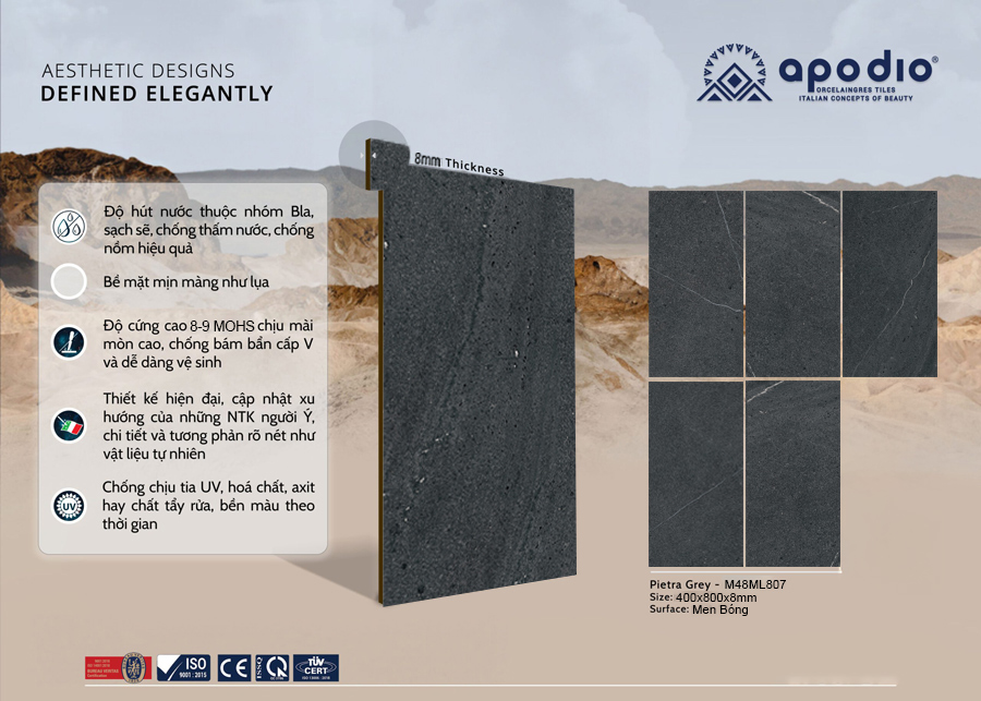Gạch Apodio A48NB402 là sự lựa chọn hoàn hảo cho những không gian kiến trúc đòi hỏi sự mạnh mẽ, cá tính và đẳng cấp. Với kích thước 40x80cm, sản phẩm mang đến giải pháp ốp lát đa dạng, giúp kiến tạo nên những bề mặt diện tường và sàn nhà có chiều sâu nghệ thuật vượt trội.