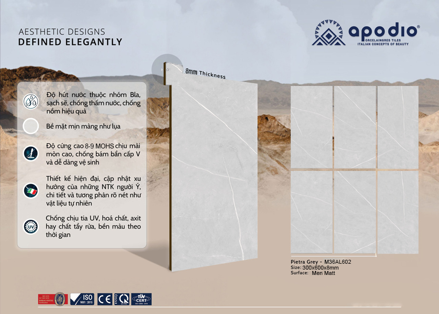 Gạch Apodio M36AL602 sở hữu tông màu xám trung tính hiện đại, một sắc màu đại diện cho sự tĩnh lặng và chiều sâu kiến trúc. Điểm nhấn đặc trưng của sản phẩm nằm ở bề mặt men mờ kết hợp cùng hiệu ứng vân marbel. Sự kết hợp này không chỉ mô phỏng chân thực vẻ đẹp thô mộc của đá tự nhiên mà còn tạo nên một bề mặt diện tường và sàn nhà có độ nhám nhẹ, mang lại cảm giác vững chãi và an tâm trong quá trình sử dụng.