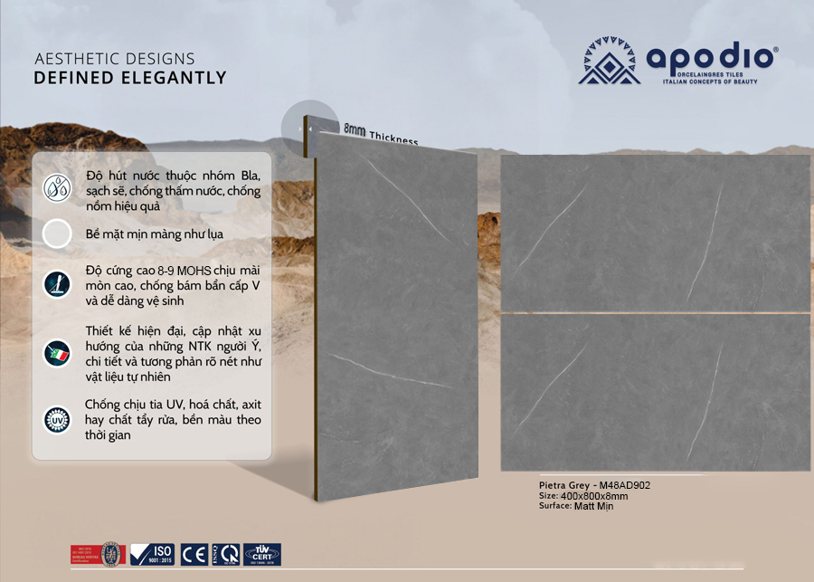 Apodio M48AD902 sở hữu tông màu xám trung tính, một sắc màu bền bỉ với thời gian và dễ dàng kết hợp với nhiều phong cách nội thất khác nhau. Điểm đặc trưng của mã sản phẩm này nằm ở bề mặt men mờ mịn kết hợp cùng hiệu ứng vân nhám tinh tế. Sự kết hợp này không chỉ tạo nên chiều sâu về thị giác, mô phỏng vẻ đẹp thô mộc của đá tự nhiên mà còn mang lại cảm giác vững chãi và chân thực trong mỗi lần tiếp xúc.