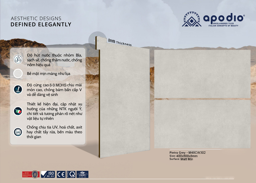 Apodio M48CW302 mang tông màu ghi sáng chủ đạo, một gam màu trung tính tạo nên sự thanh lịch và thoáng đãng cho không gian sống. Điểm nhấn đặc trưng của sản phẩm chính là sự kết hợp giữa bề mặt men mờ mịn và họa tiết vân nhám xi măng chân thực. Hiệu ứng này mô phỏng trọn vẹn nét thô mộc, cá tính của chất liệu bê tông đương đại nhưng vẫn giữ được sự tinh tế, mượt mà khi chạm tay. Đây là giải pháp hoàn hảo để kiến tạo nên những không gian đậm chất phong cách nội thất tối giản hoặc công nghiệp.