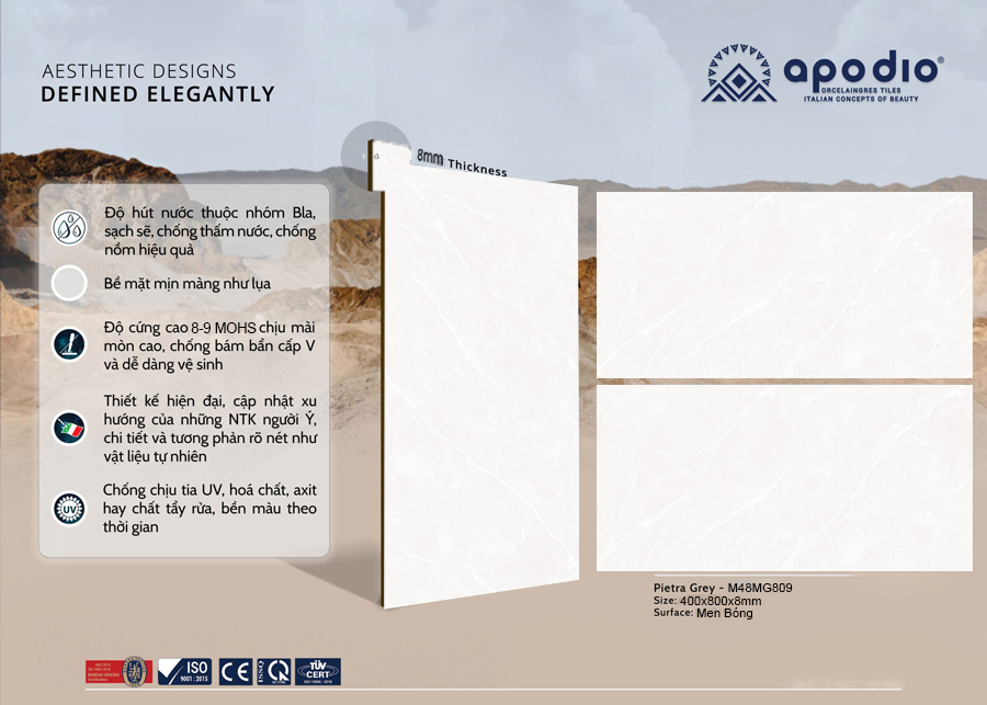 Gạch Apodio M48MG809 là minh chứng cho sự kết hợp hoàn hảo giữa nét đẹp cổ điển và công nghệ sản xuất hiện đại. Với kích thước 40x80cm, mẫu gạch này mang đến giải pháp ốp lát tối ưu, giúp không gian trở nên rộng mở, sáng rõ và tràn đầy sức sống.